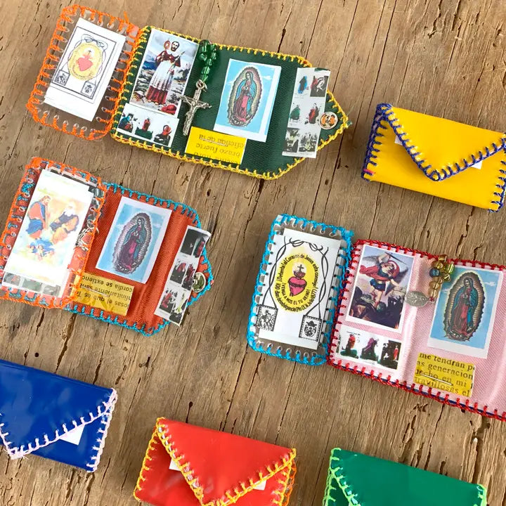 - Traditional small plastic "wallet" with mini rosary, saint pictures, and a selection of the prayer "La Magnifica".