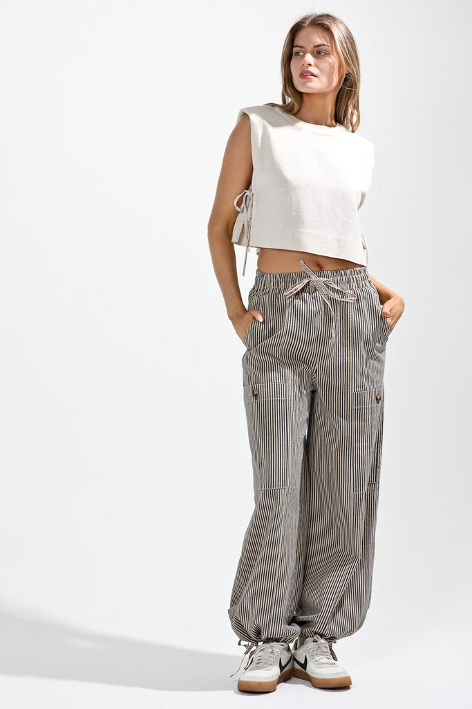 Ahoy, fashion adventurers! Our Ticking Stripe Jeans bring the fun with their navy and cream stripes and oh-so-comfy elastic waist. Feeling wild? Let them flow wide! Feeling fancy? Cinch them up with the adorable contrast drawstring! With pockets galore (front, side, and back!), these vintage-washed wonders are ready for whatever mischief you've got planned. The contrast tie at the waistband is just the cherry on top of this denim delight!