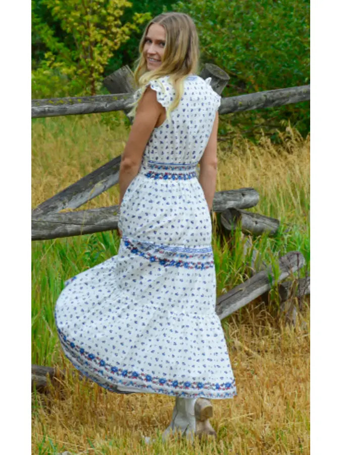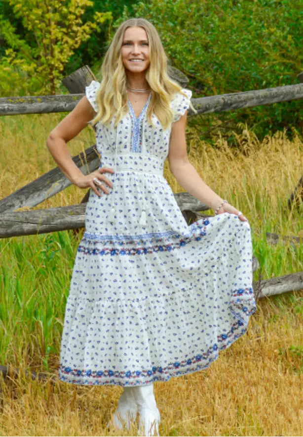 Embrace romantic sophistication with the Wildflower Dress, where delicate florals meet vintage-inspired design. Fully lined for comfort and confidence, this piece features a charming floral print accented by a bold border that grounds its ethereal aesthetic. Flutter sleeves and a tiered maxi silhouette deliver graceful movement, while a smocked waistband and contrast-trimmed V-neckline provide subtle structure. The result is an effortlessly feminine dress that balances airy elegance with polished refinement—perfect for occasions calling for understated charm and timeless appeal.