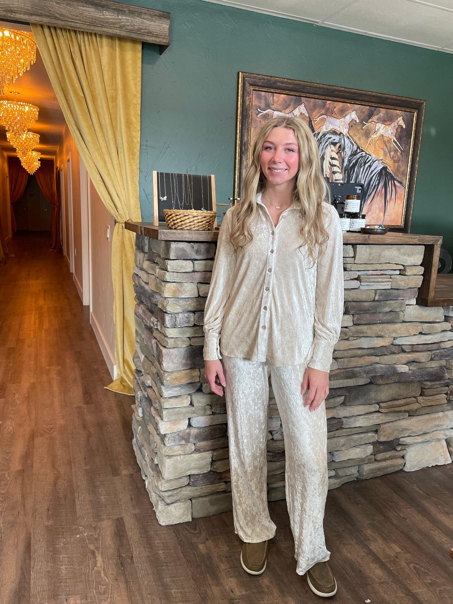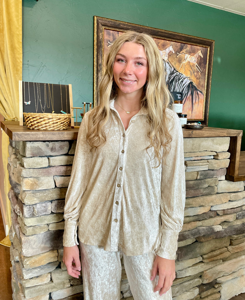 Experience luxurious elegance with our Wave Velvet Champagne Blouse. The wavy champagne velvet fabric adds a touch of sophistication while the gathered cuffs with three-button closure provide a flattering fit. Wear it alone for a chic look or pair with matching pants for a stylish and coordinated outfit.
