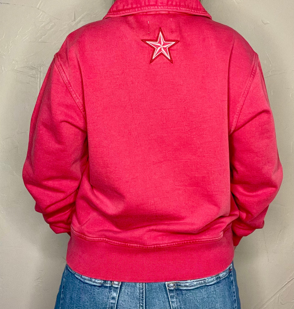 Add a touch of western charm to your casual wardrobe with this red quarter zip sweatshirt. It features contrast embroidery with added studs across the chest, a stitched horseshoe detail on the front, and a star on the back for a classic cowboy-inspired look. The zip-up collar allows for easy layering, while the relaxed fit makes it perfect for everyday wear.