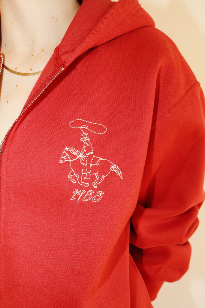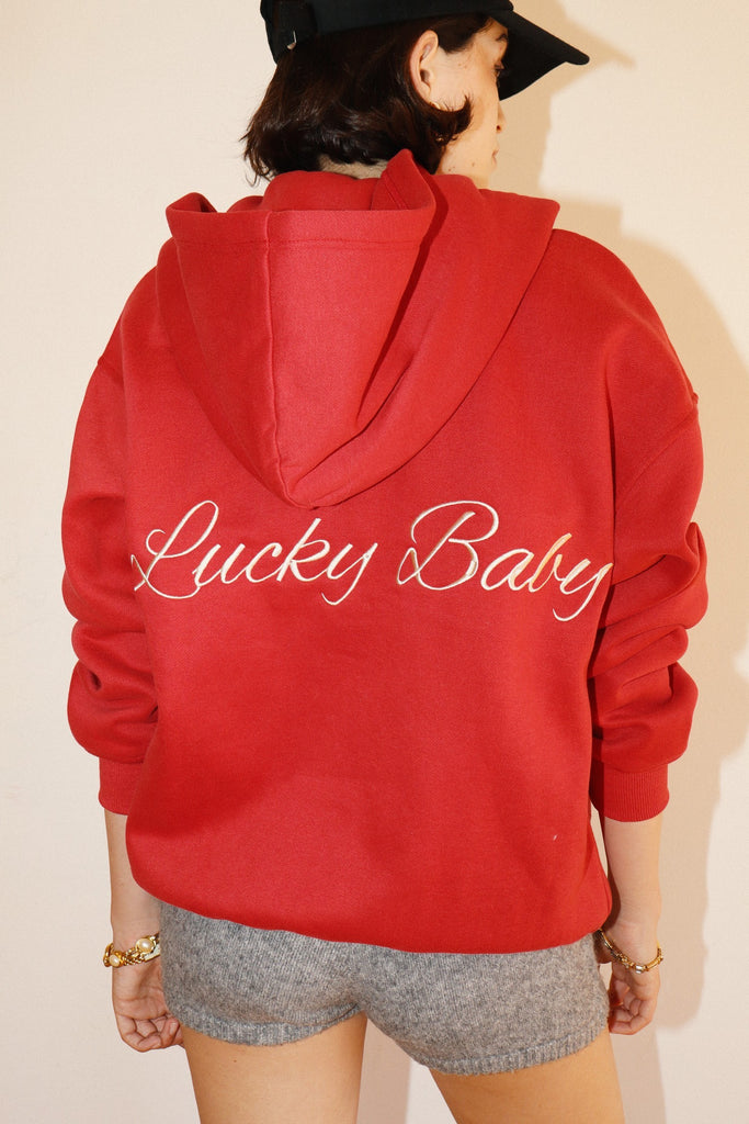 "Lucky Baby" Hoodie is perfect to get cozy in, with its fun embroidered cowboy roper gracing the front, while "Lucky Baby" in crisp white embroidery claims the back—because subtlety is overrated. Perfectly weighted for layering or solo missions, this sweatshirt keeps you warm without the bulk, so you can move freely and look effortlessly cool. Whether you're channeling your inner cowboy or just want a hoodie with character, this one's ready to become your new favorite.