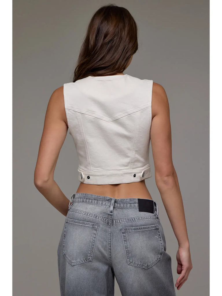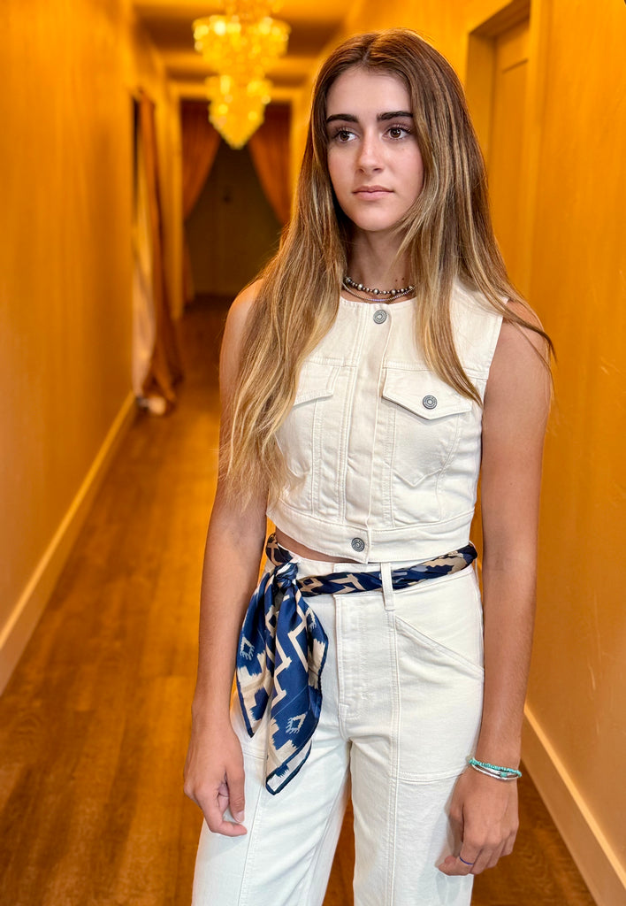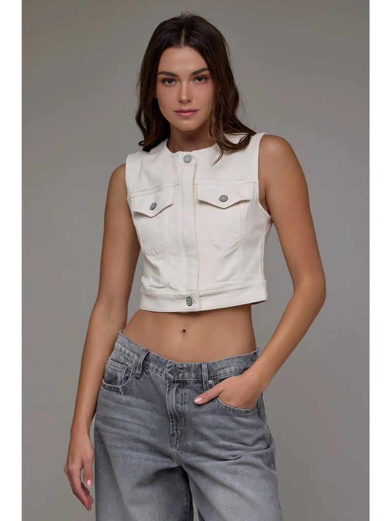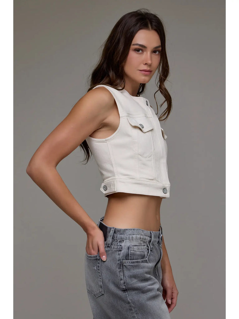 This cream-colored cropped vest brings an effortlessly cool western edge to your outfit. Made with sturdy yet soft fabric, it features flap chest pockets, silver snap buttons, and a flattering structured fit that hits perfectly at the waist. Great for layering over tanks, tees, and dresses!