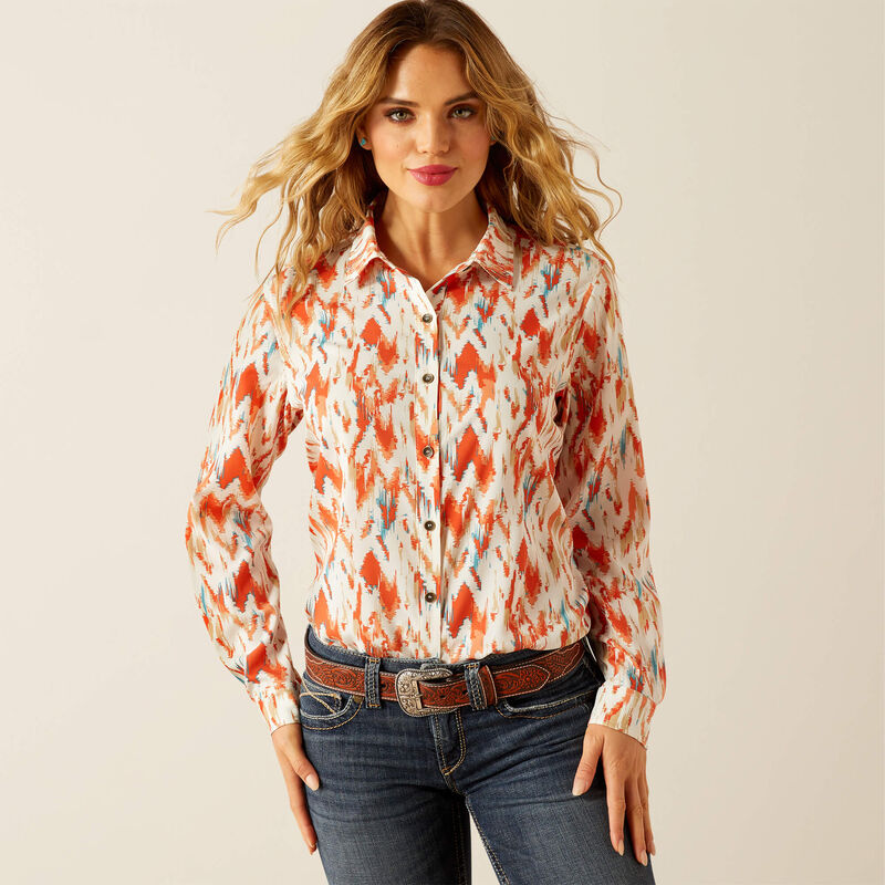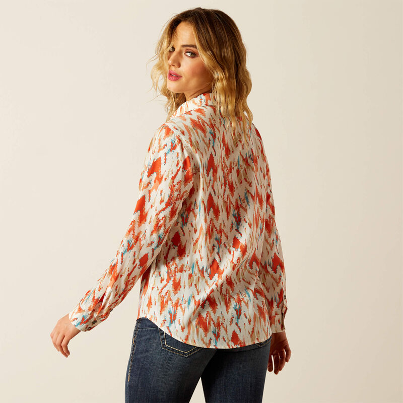 This painted watercolor western shirt offers versatile styling options, from dressing it up to wearing it solo or layering it under a blazer. With its unique watercolor design, it adds a touch of artistry to your everyday wardrobe. The possibilities are endless with this button-down shirt.