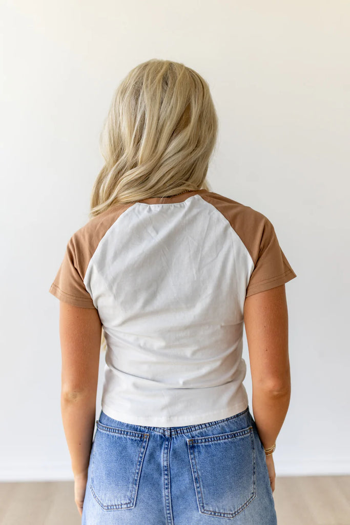 This fitted ringer crop tee features a contrasting tan sleeves and neckline with a running horse graphic across the front.