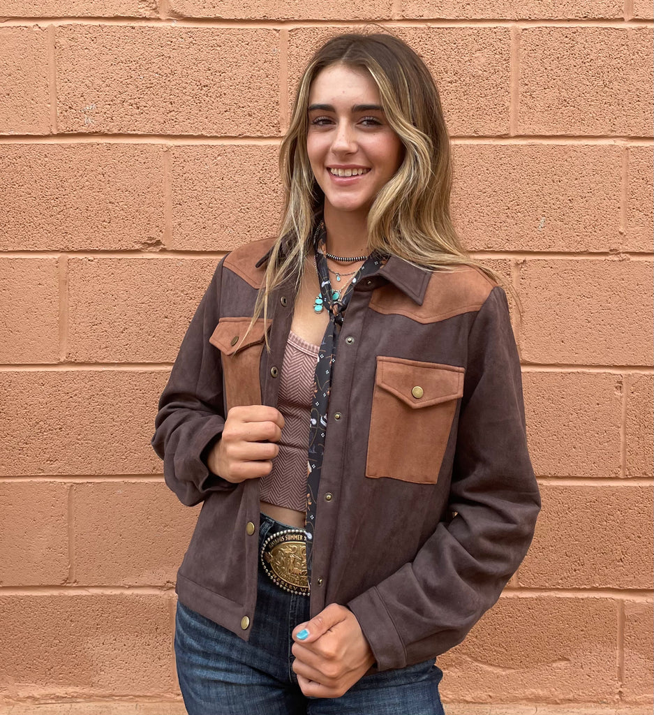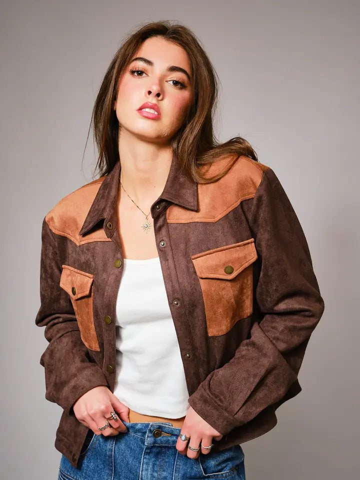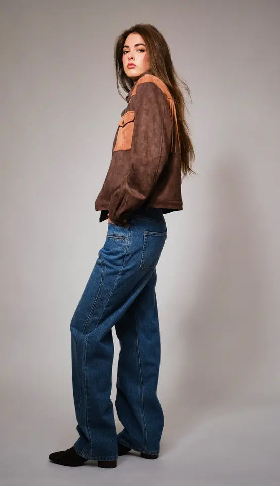 The Tobie Faux Suede Jacket expertly blends Western aesthetics with a distinct 1970s influence. Crafted from soft faux suede, it showcases bold color block panels that enhance its structured silhouette. The signature dramatic back fringe adds dynamic movement, elevating the jacket’s vintage-inspired appeal. Designed for those seeking authentic retro style with modern craftsmanship, this piece is both a statement and a versatile layering option.