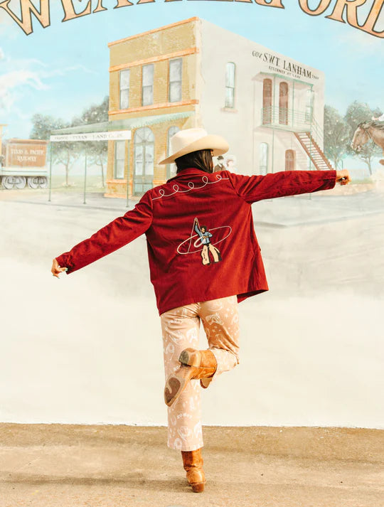 Saddle up in Western style with the Cowboy Hank Blazer, a statement piece that channels authentic rodeo spirit. Crafted from soft corduroy, this blazer features intricate white embroidered rope detailing along the collar, lapels, yoke, and pockets for refined Western flair. The long fringe trim cascading across the front yoke adds movement and drama, while the showstopping embroidered cowboy design on the back ensures you'll turn heads. Perfect for those who embrace bold, unapologetic style with a touch of frontier heritage.