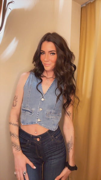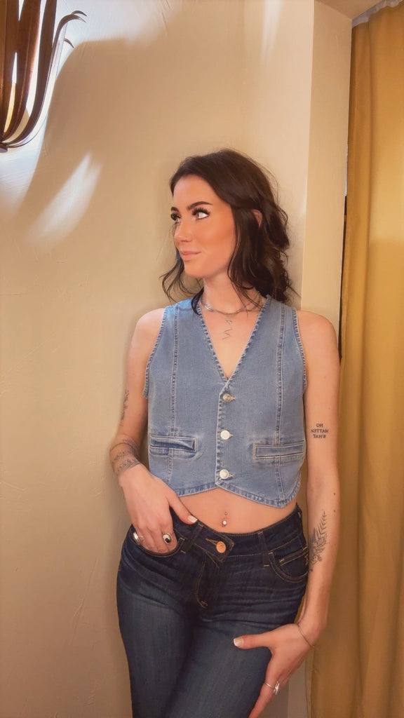 Elevate your style with our Denim Vest. Versatile for any occasion, this vest can be worn alone or layered for the perfect look. Made with durable denim, this vest is sure to be a staple in your wardrobe. Upgrade your fashion game and effortlessly rock this timeless piece.