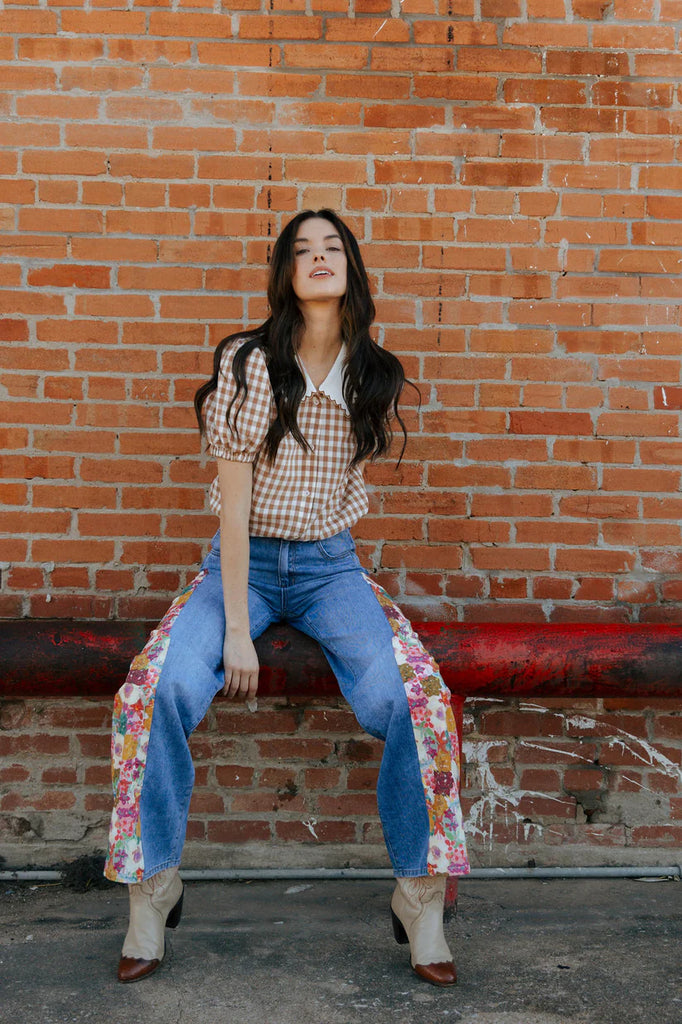 This charming brown gingham top features an adorable Peter Pan collar that adds a touch of whimsy to your outfit. Its sweet pattern and playful design make it perfect for brightening up any day with a vintage-inspired flair. Comfortable and cute, it’s a delightful choice for casual outings.