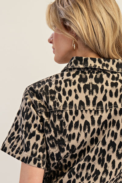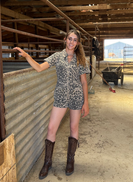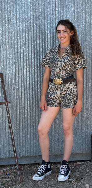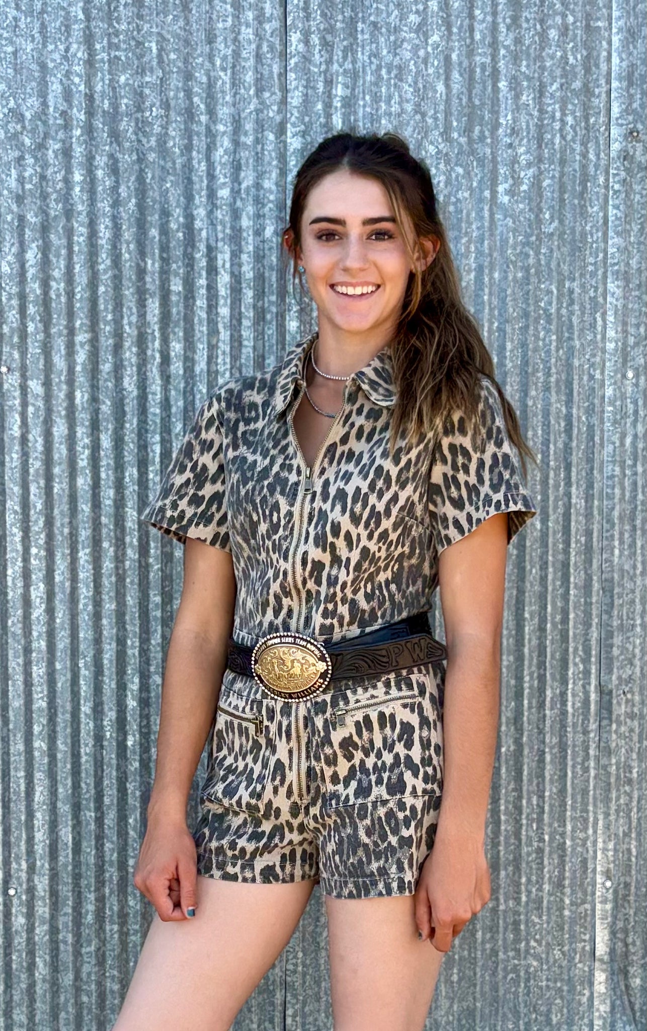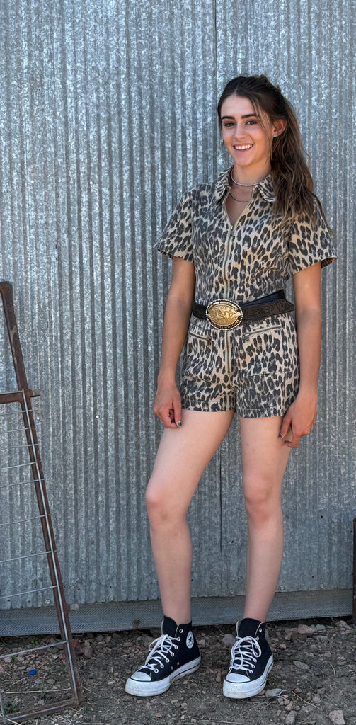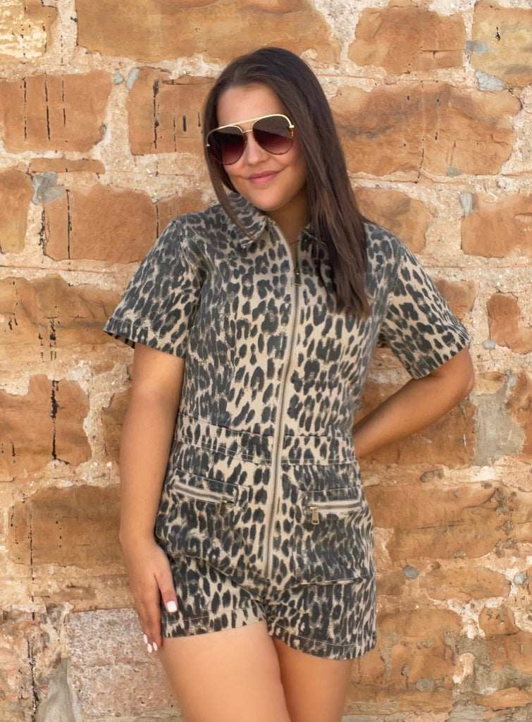 Add a touch of fun to your wardrobe with the Easton Leopard Romper. This denim romper features a unique twist with its fun leopard print design. With a convenient zip closure, it's easy to throw on for any occasion. Stay stylish and comfortable with this must-have addition to your closet.