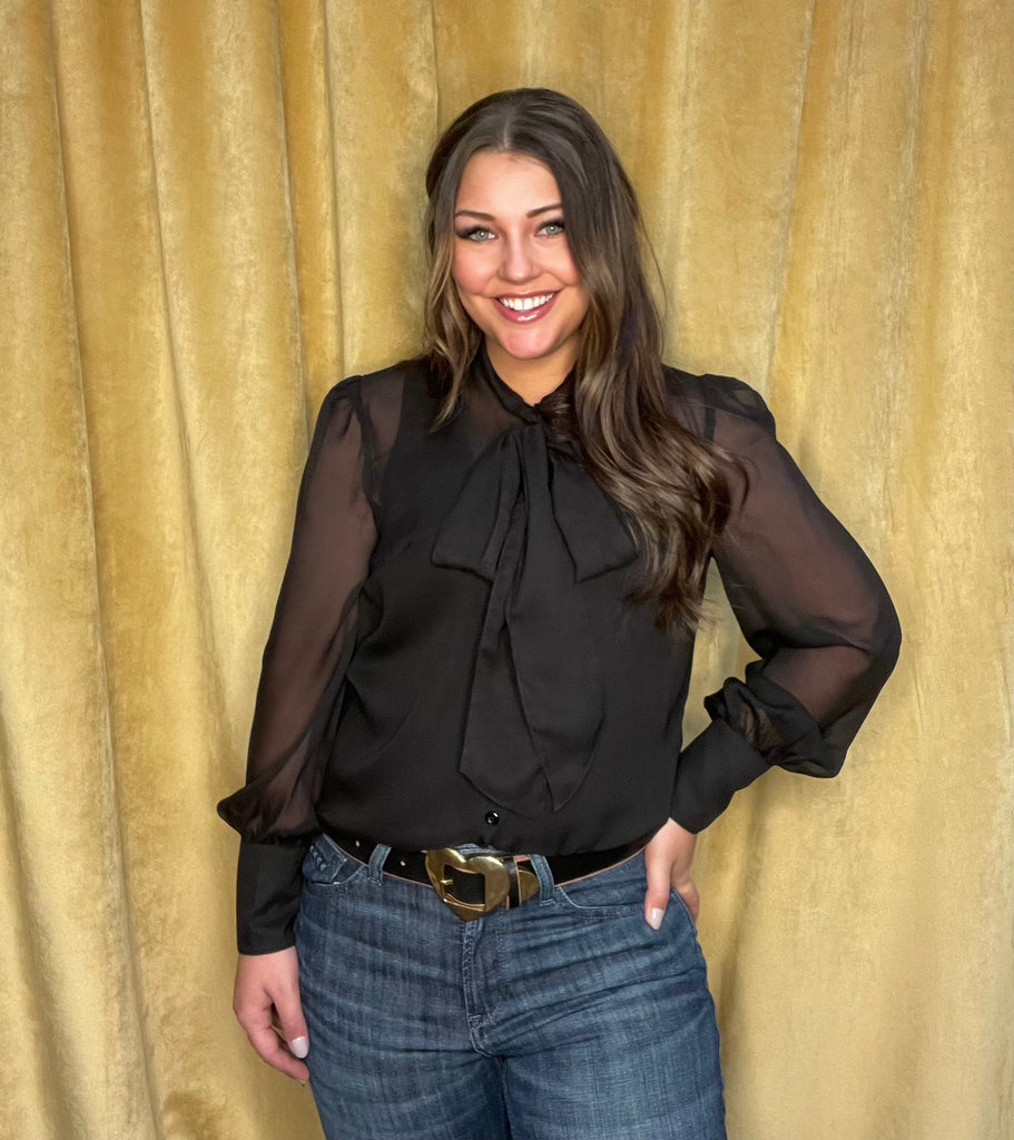 Elevate your wardrobe with this versatile Houston Sheer Black Blouse, designed for effortless sophistication. The charming bow tie detail and delicate puff sleeves add personality to a timeless silhouette, while the semi-sheer fabric creates an elegant, refined look. Whether you're dressing up for a special occasion or heading out for a night on the town, this blouse transitions seamlessly from day to evening. A wardrobe essential that pairs beautifully with tailored trousers, skirts, or denim for countless styling possibilities.
