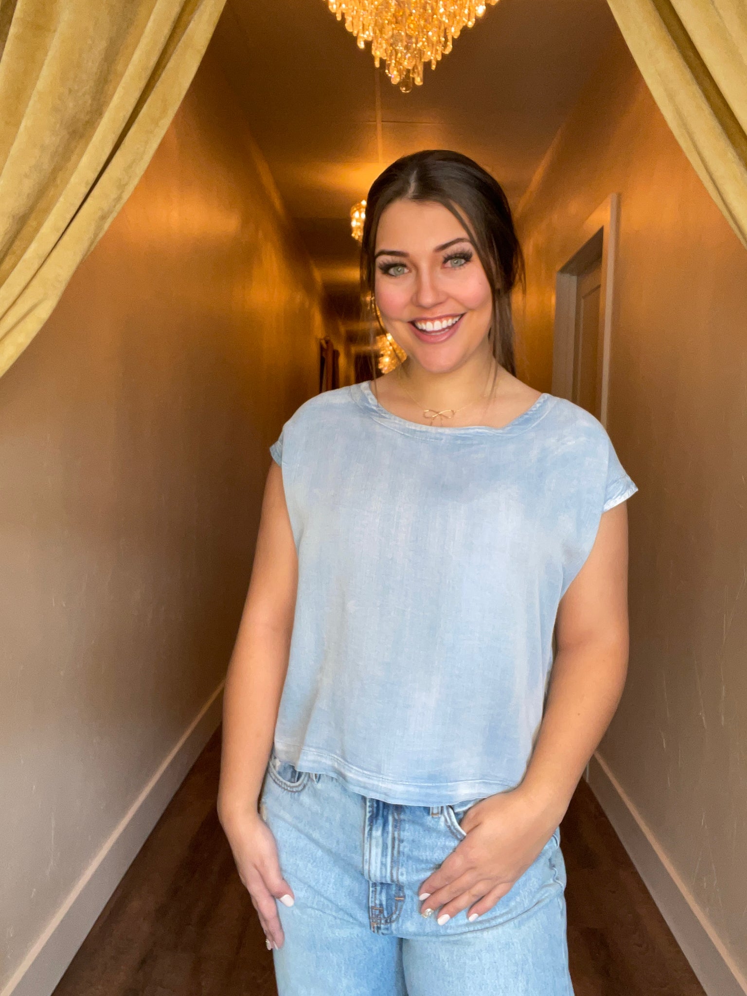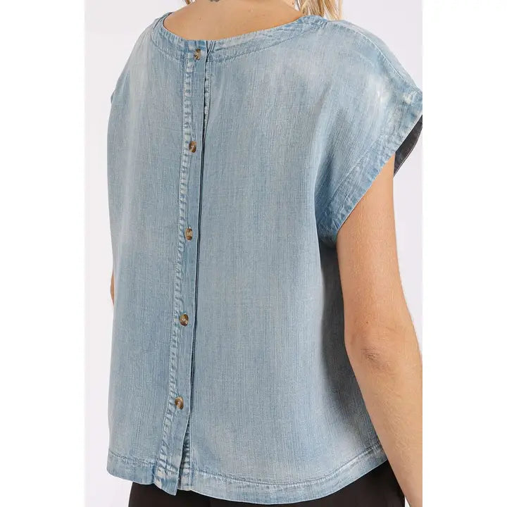 The Kal Chambray Top features a washed Tencel chambray denim fabric, cap sleeves, and a fun button-up detail on the back. Designed to be light, breezy, and Spring-ready, this top is the perfect addition to your wardrobe. Look stylish and feel comfortable in this versatile and trendy top.