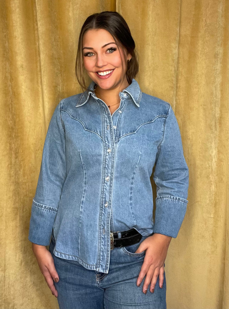 The Juliette Denim Shirt features a medium wash for a natural, rugged overworn look that adds effortless style to any outfit. Its distinctive flare sleeves and binding hem detail provide a unique, fashionable edge, while darts at the front and back ensure a flattering, tailored fit. Enhanced by front yoke detailing, this shirt combines classic western denim charm with modern design for a versatile wardrobe staple.