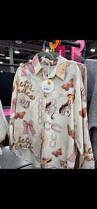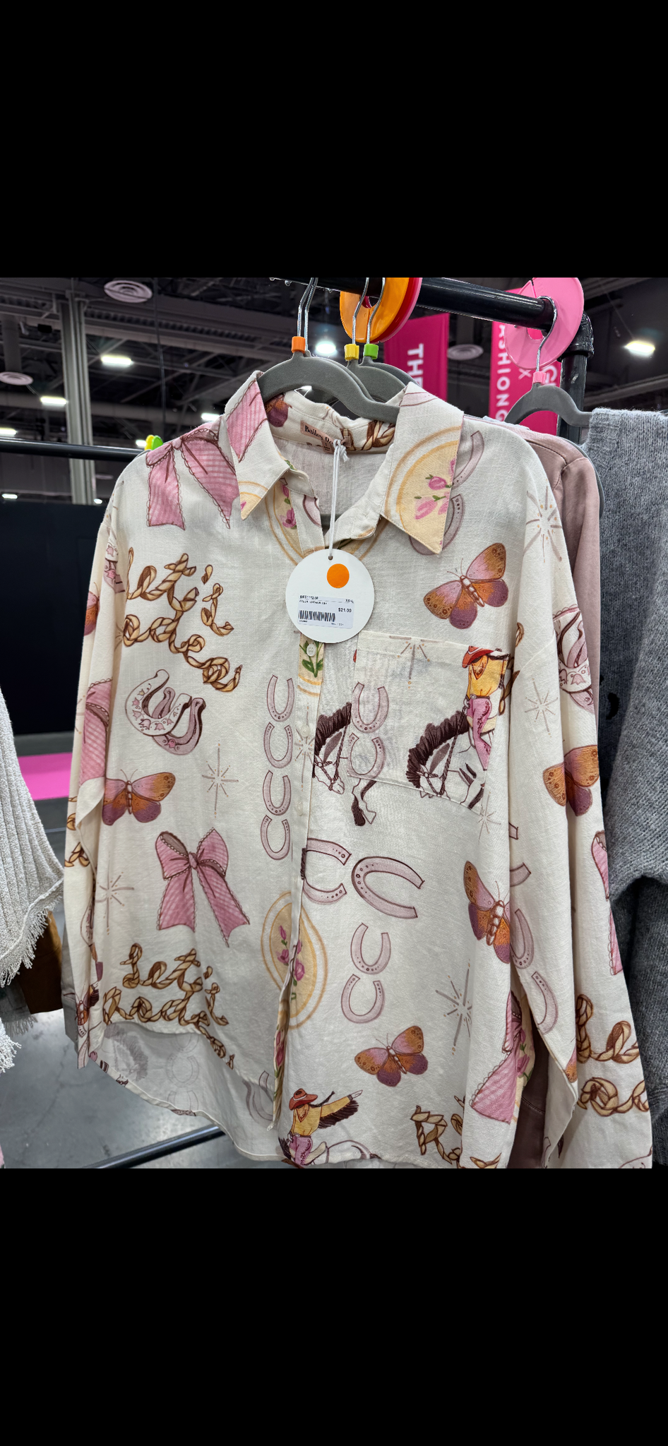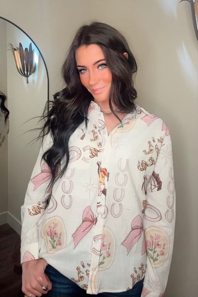 Saddle up in the Bailey Rose Western Shirt! This soft cotton shirt features a beautiful western print, combining feminine rodeo motifs with a relaxed fit. Perfect for adding a touch of western charm to any outfit.