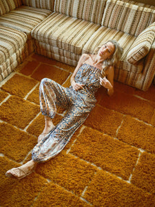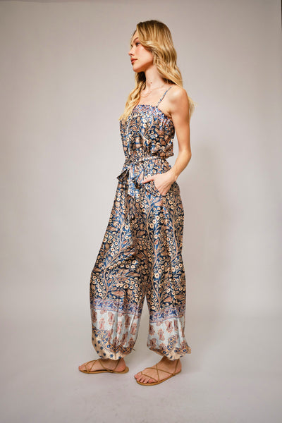 This lightweight satin jumpsuit features a vibrant ethnic boho print that brings a playful spirit to your wardrobe. With delicate cami straps, a stretchy waist tied just right, and elastic cuffs, it offers a relaxed, flowy silhouette perfect for dancing through your day with ease and style.