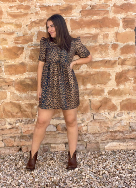 Bold and effortlessly chic, this cheetah print dress is a must-have for those who love animal-inspired fashion. With an all-over cheetah print n a flattering, relaxed silhouette, this dress features a modest neckline and length, making it perfect for both casual and semi-formal occasions. The front tie detail and slightly puffed sleeves with elastic cuffs add a touch of elegance and comfort.