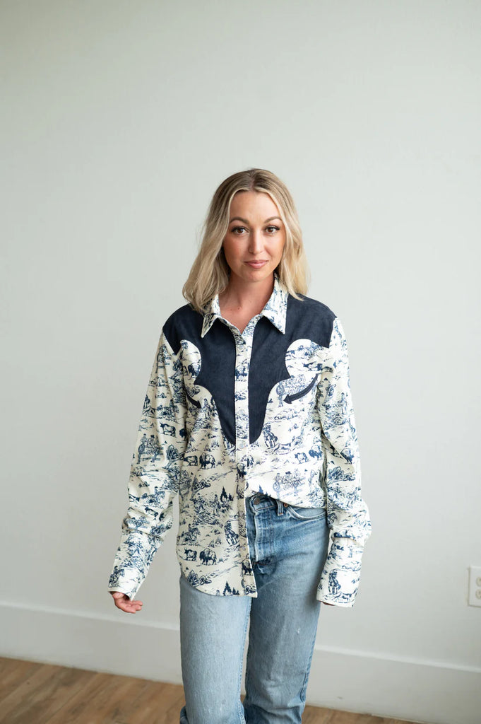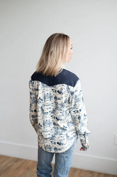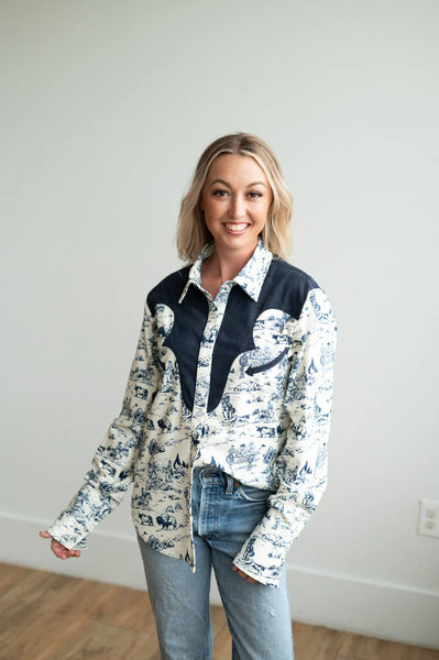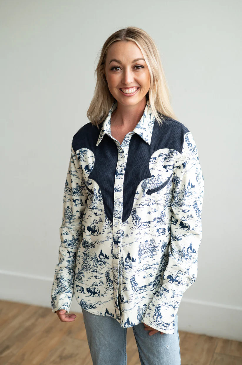 Crafted from soft corduroy, the Buffalo Cowboy Shirt features a classic western print paired with traditional yoke detailing and pearl snap buttons. This fabric crush combines comfort with timeless style, making it a versatile addition to any wardrobe.