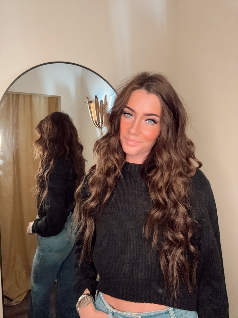 Add a touch of cozy charm to your look with this cropped knit sweater, featuring a classic crew neckline and long sleeves. This sweater is crafted from a warm, soft knit fabric. The cropped length makes it perfect for layering over high-waisted jeans or skirts, while the ribbed details at the hem and cuffs provide a snug, comfortable fit.