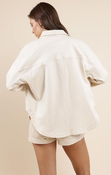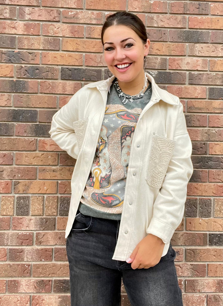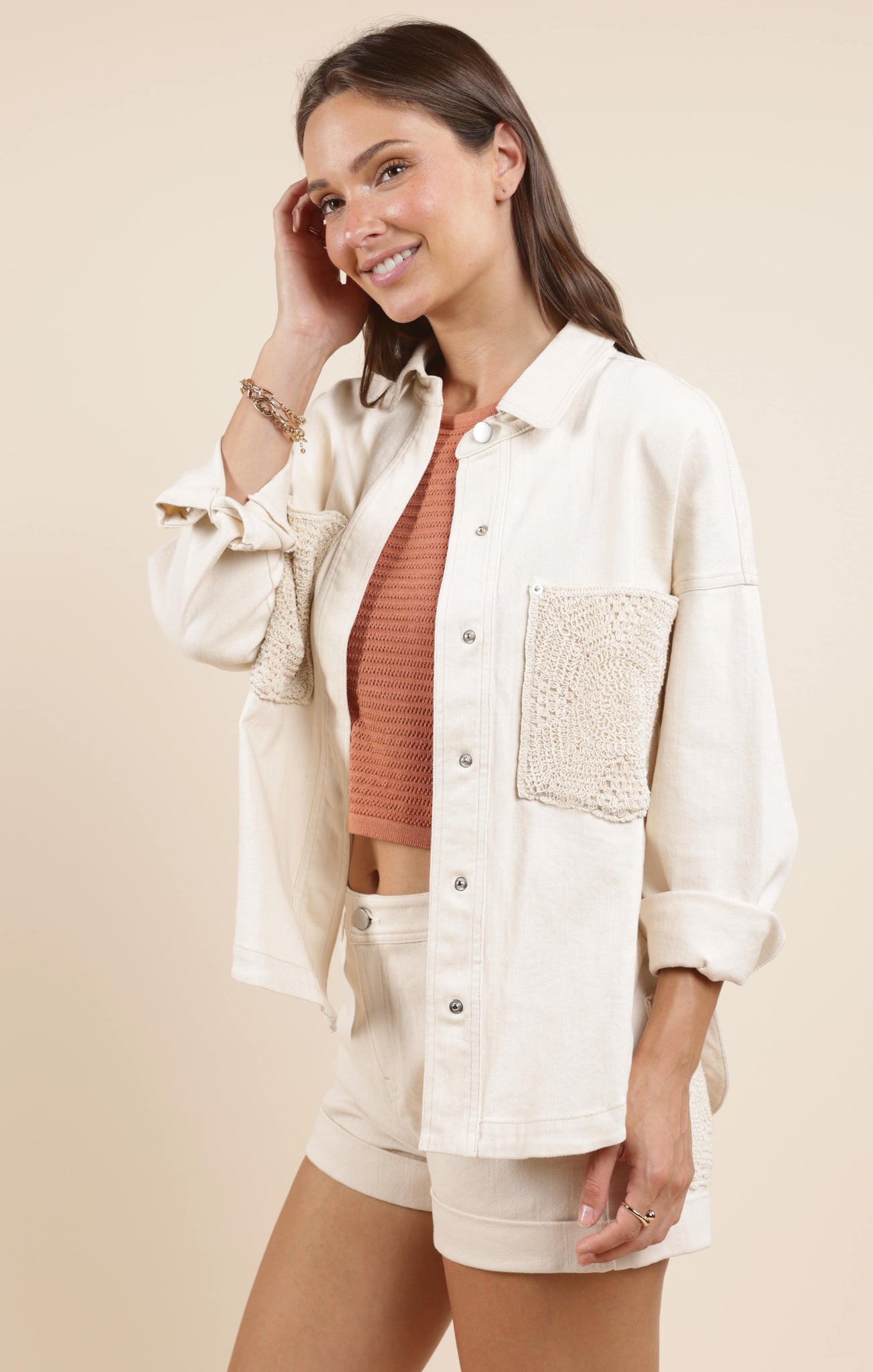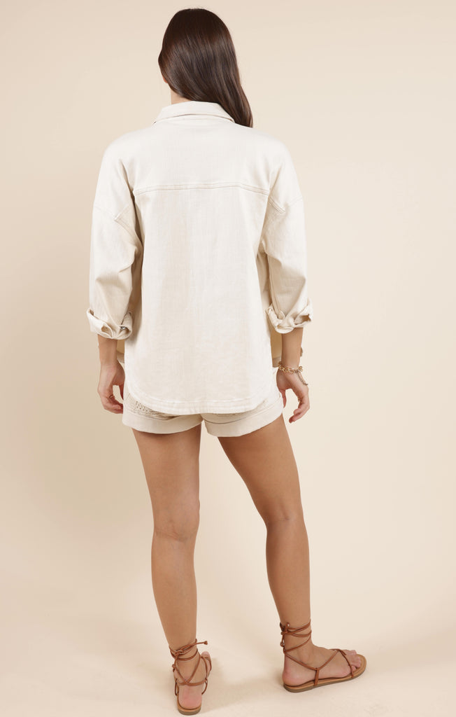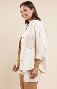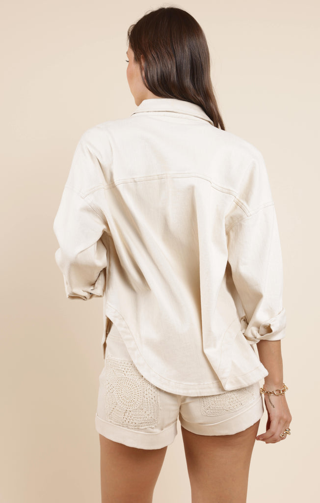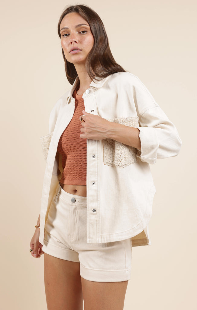 This oversized button-down shacket is the perfect mix of laid-back and luxe. Crafted in a creamy off-white denim fabric, it features standout crochet front pockets that add a stylish pop. Throw it over a graphic tee and shorts for a cool summer look or layer it with jeans and boots for a cozy fall transition piece.