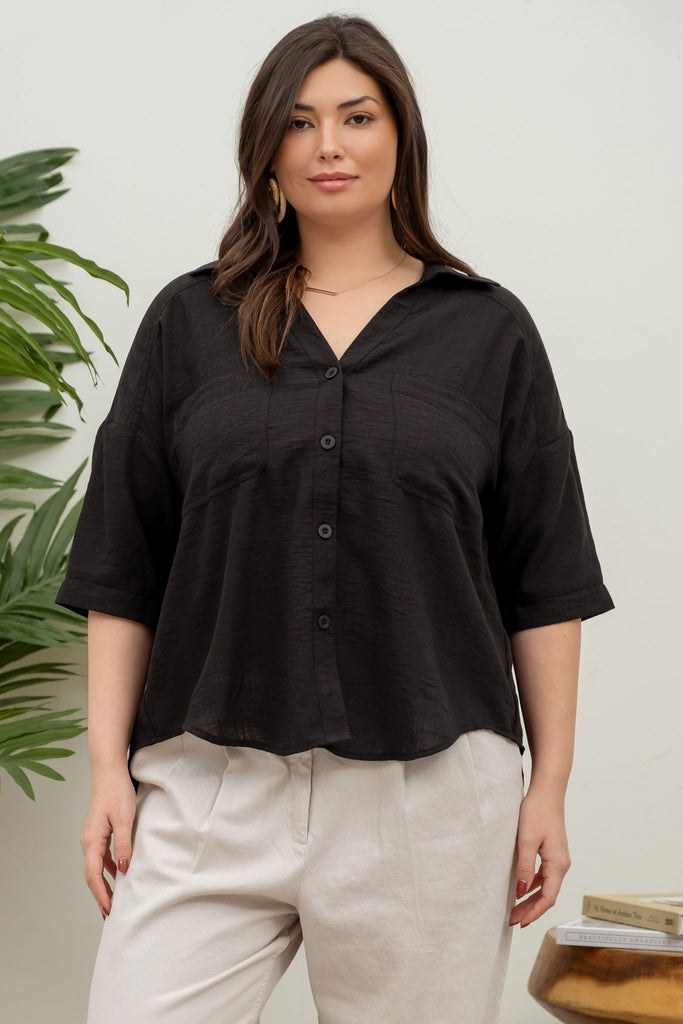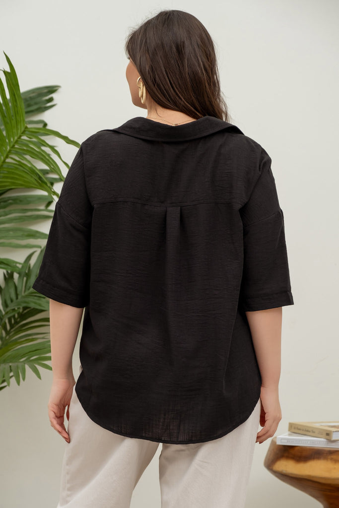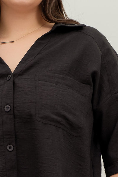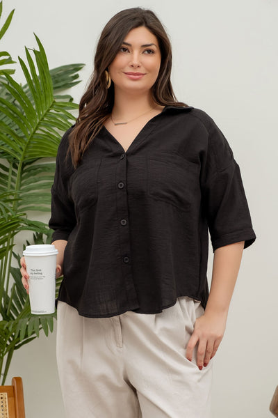 This Black Gauze Top features a relaxed fit with a slightly cropped length for effortless comfort and style. The woven fabric and back yoke detail add style, while two front pockets provide practical convenience. Its versatile design easily pairs with any outfit, making it a go-to piece for your wardrobe.