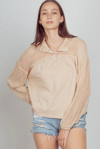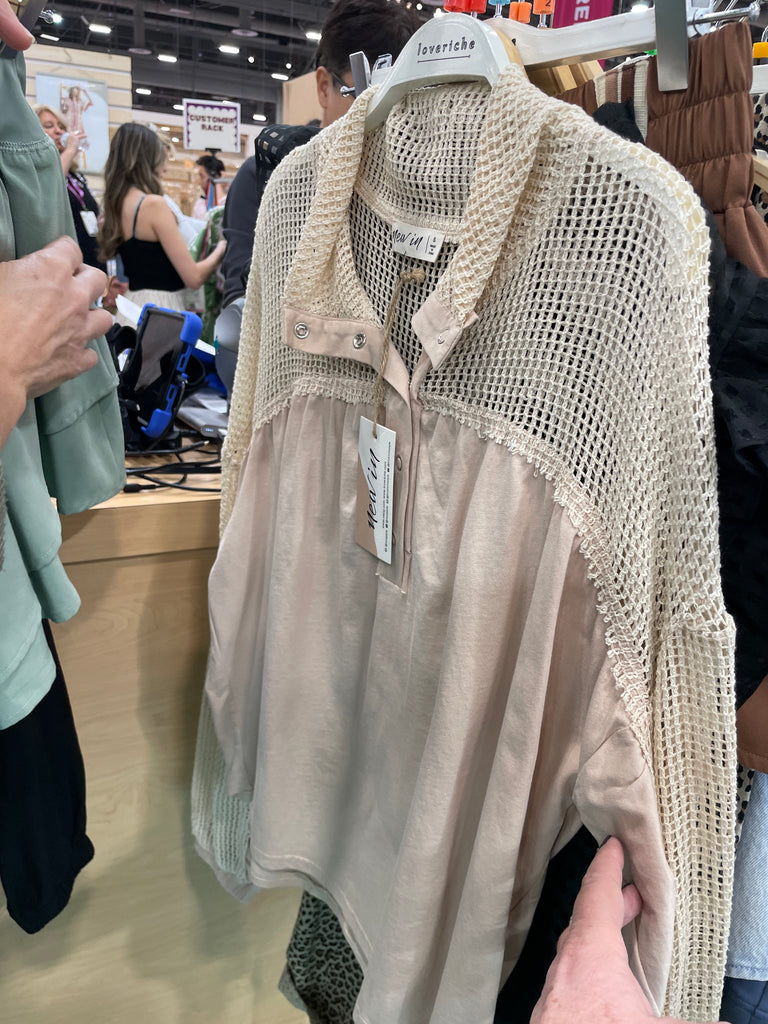 The Hettie Blouse is a stylish and versatile addition to any wardrobe. With its drop shoulder and crochet and knit design, this blouse offers both comfort and sophistication. The half snap closure adds a touch of convenience while the tan color complements any outfit. Elevate your style with the Hettie Blouse.