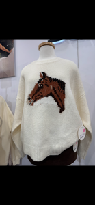 This cozy, cream-colored sweater is a bold and playful nod to western style. Featuring a large, detailed horse head graphic knitted into the front, it brings rustic charm to a classic silhouette. The relaxed fit and soft texture make it perfect for layering or lounging.