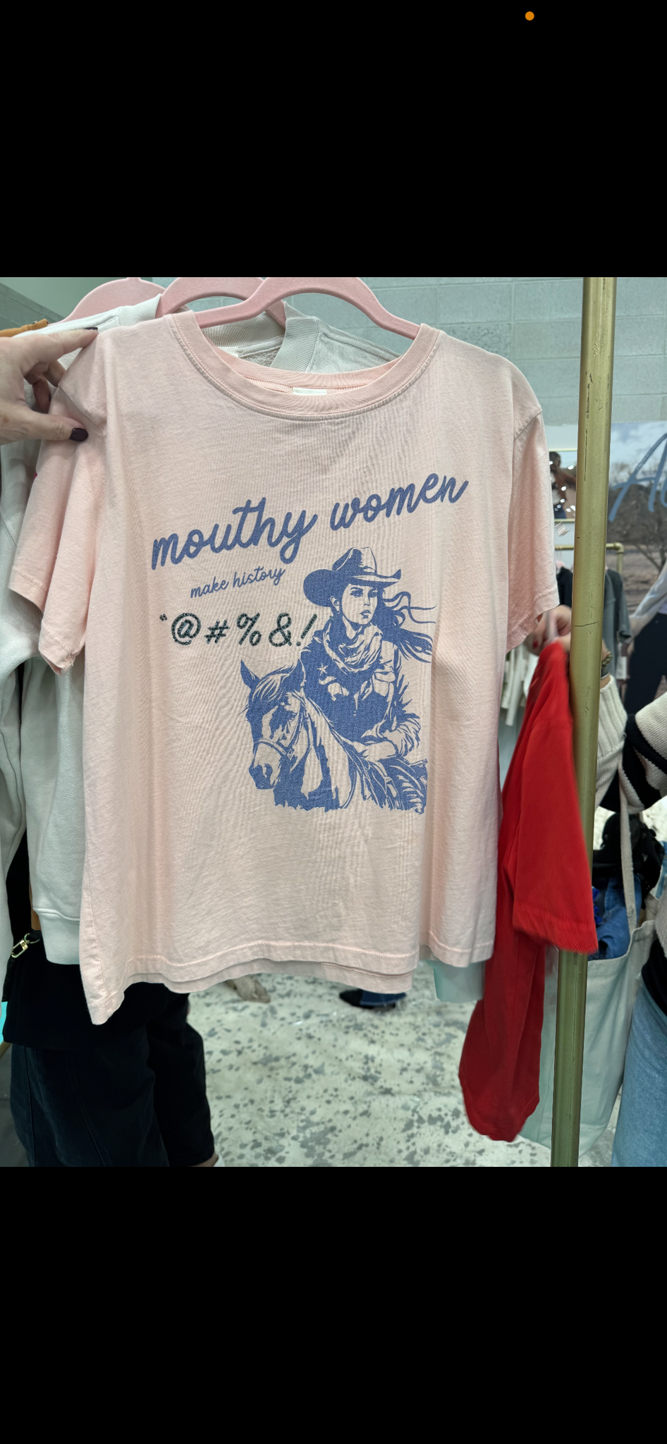 This playful Mouthy Women Western Tee is your new go-to favorite. Featuring sparkling rhinestones and stylish distressed lettering on a soft light pink fabric, it adds a fun, bold touch to any outfit. Plus, it’s proudly made in America, combining quality with attitude for a look that speaks volumes.