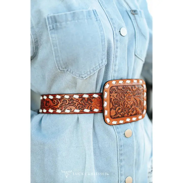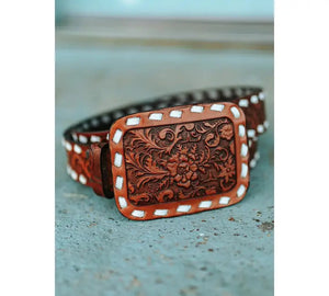 Add a touch of rugged charm to your outfit with this stunning tooled leather belt and buckle combo! Featuring a richly detailed floral design, the rectangular buckle is bordered with white stitching for that perfect pop of contrast. This is a standout piece whether you're dressing up your denim or cinching your favorite dress.