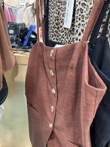 Introducing the Asia Woven Top! This button-front, sleeveless top features adjustable straps and front pockets. Perfect for any occasion, its versatile design allows for easy styling and its woven fabric ensures comfort. Upgrade your wardrobe with this must-have piece!